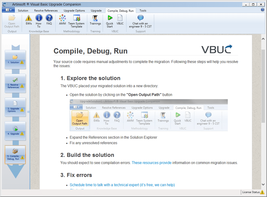 Considering the limitations of the Upgrade Wizard, is there a way to customize or extend its functionality? No, but there’s an enhanced version (or enterprise edition) of the upgrade wizard called the, developed and sold by, the same company that built the Upgrade Wizard for Microsoft. It can parse database schema definition files to obtain additional information about field data types and produce improved Visual Basic.NET code. This and other enhancements can help you further shorten your upgrade process by automating more of it. It can even be customized to extend its functionality, according to the characteristics of the application to be migrated. Does the Upgrade Wizard provide any type of information after the conversion process? When the upgrade wizard upgrades your project, it generates a report that can be used as a guide for the manual changes that your project requires afterwards.